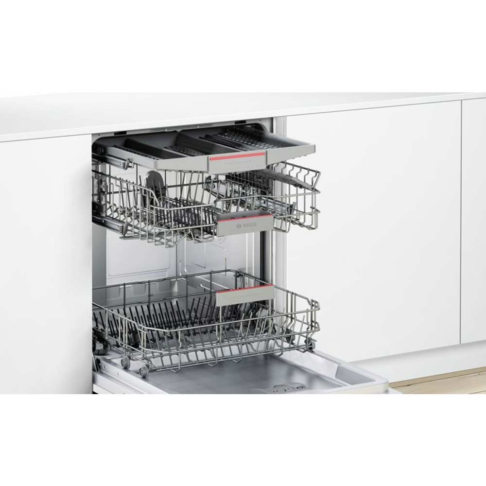 The BOSCH SMV46KX04E is a sleek, fully integrated 60 cm dishwasher suited to modern kitchens in need of discreet functionality. With a 13-place setting capacity and low noise operation (46 dB), it stands out for its efficiency (energy rating E), flexible loading options, and smart water-saving features like AquaSensor and AquaStop. Expect reliable drying (Class A), a variety of wash cycles—including fast and eco modes—and thoughtful comfort features like the VarioFlex basket and delay start option.