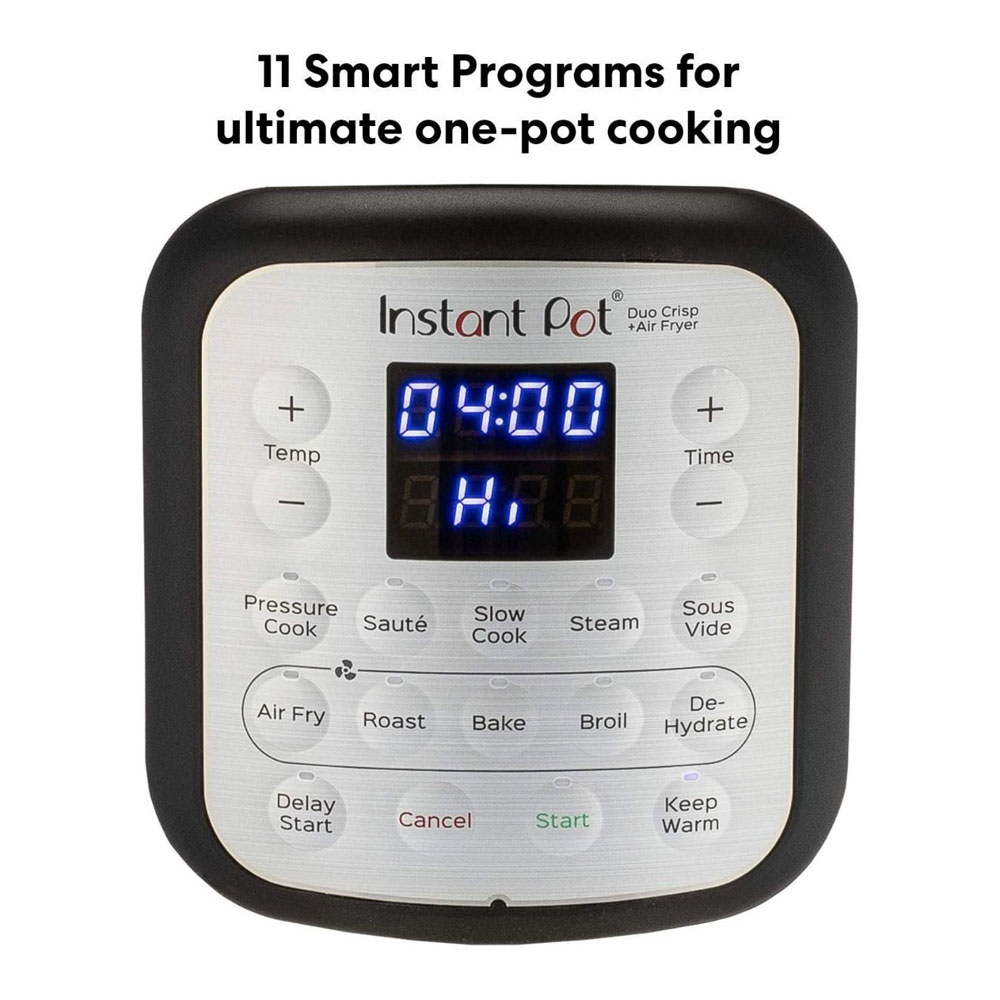 The Instant Pot Duo CrispTM lets you cook and crisp all of your favorite foods in one pot. Enjoy the greatest features of both the Instant Pot Duo and the Instant Vortex Air Fryer with ease by simply swapping over the two detachable lids. The Pressure Cooker, Air Fryer, Slow Cooker, Steamer, Sauté, Food Warmer, Roast, Bake, Broil, Sous Vide, and Dehydrate are just a few of its eleven customisable Smart Programs for easy one-touch meals.