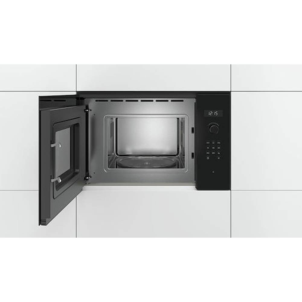The BOSCH BFL554MB0 is a built-in microwave oven with 900W power and a spacious 25 litres capacity, ideal for reheating, defrosting and everyday cooking tasks. It features include AutoPilot 7 automatic programmes, LED display with rotary and touch controls, a 31.5cm glass turntable and LED interior lighting. Designed to install flush into a 60 cm kitchen unit with a sleek black finish.