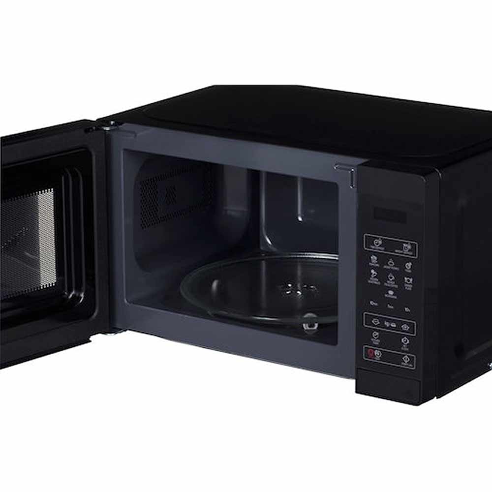 The SHARP YCMS02EB is a compact 20L microwave with 800W cooking power and 11 power levels, ideal for reheating, defrosting and everyday meals. It features fully digital controls with multiple automatic programmes, defrost function, child lock safety, interior cavity lighting and easy-clean turntable.