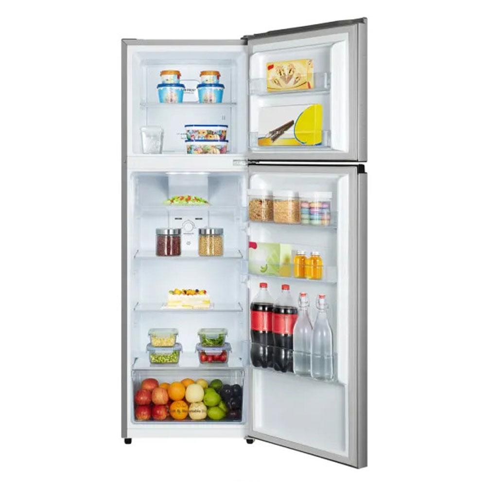 The HYUNDAI HMTM247EI is a top-mount refrigerator with a 247L net capacity, E energy class, inox color, and is fully Frost-free. It features multi-air flow for even temperature distribution and LED lighting.