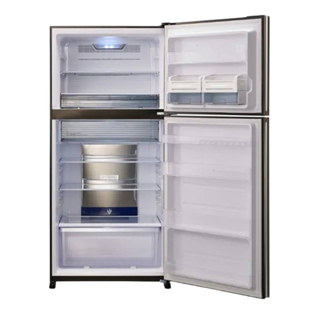 The SHARP SJ-YG740GSL is a fridge-freezer NoFrost Refrigerator with spacious 604L net capacity (423L fridge + 181L freezer) in an elegant silver-glass finish. It features advanced technologies like the J-Tech Inverter compressor, No-Frost system, Hybrid Cooling for optimal humidity, and Plasmacluster Ion deodoriser for fresher storage. Touch control panel with LED display, Express Freezing in ~93 minutes, and “Extra Cool” compartment (0-2 °C) for drinks or deli items.