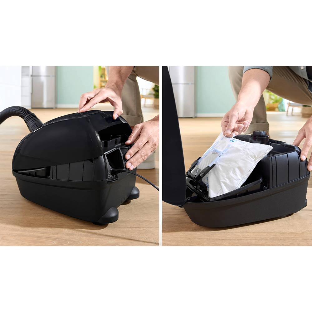 The BOSCH BGB38BA3T Series 4 is a bagged vacuum cleaner with 850W input power, 4L dust bag capacity, HEPA hygienic filter, and an operating radius of 10 m. The unit features automatic cable rewind, a turbo brush for deep cleaning on carpets, and a durable motorn in black colour.