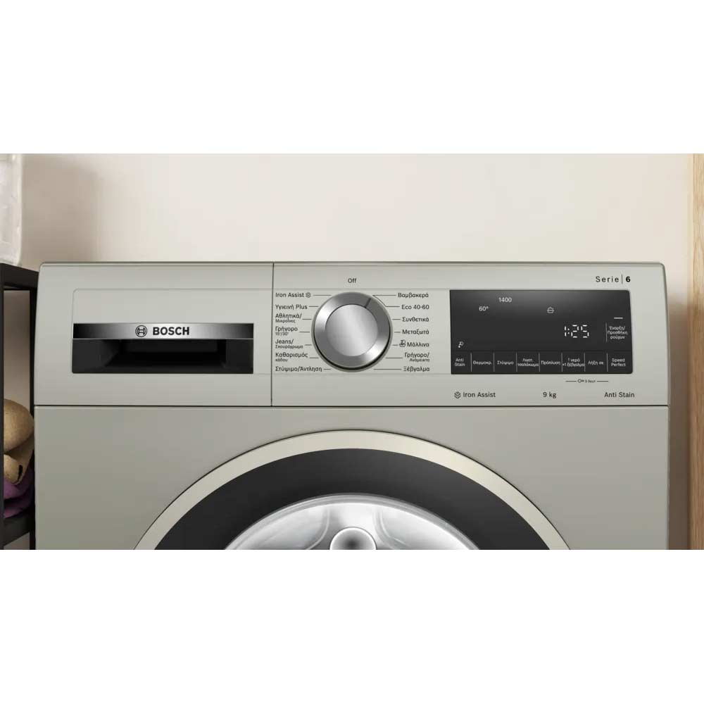 The BOSCH WGG244ZXGR is a Series 6 front-loading washing machine with a spacious 9 kg capacity and a fast 1400 rpm spin. It features smart technologies like Iron Assist steam to reduce wrinkles, ActiveWater™ Plus for efficient water use, AntiStain for tackling common stains, and SpeedPerfect to speed up washes by up to 65%—all wrapped in a quiet, durable machine that keeps your laundry fresh and effortless.