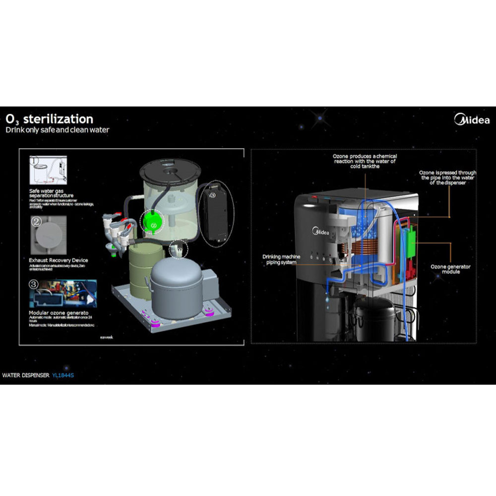 The JL2240S-E water cooler from MIDEA offers a direct connection to the supply, a two-stage filtration system, and a UV lamp for clean, clear water, making it an ideal choice for everyday carrying of water! It also features an electronic touch control panel with three pre-set temperatures for the hot and cold water outlets, a night light, and an eco mode. Lastly, a clip-on mechanism makes filter changes simple, and it features an indicator for both the UV lamp's condition and the filter's remaining life.
